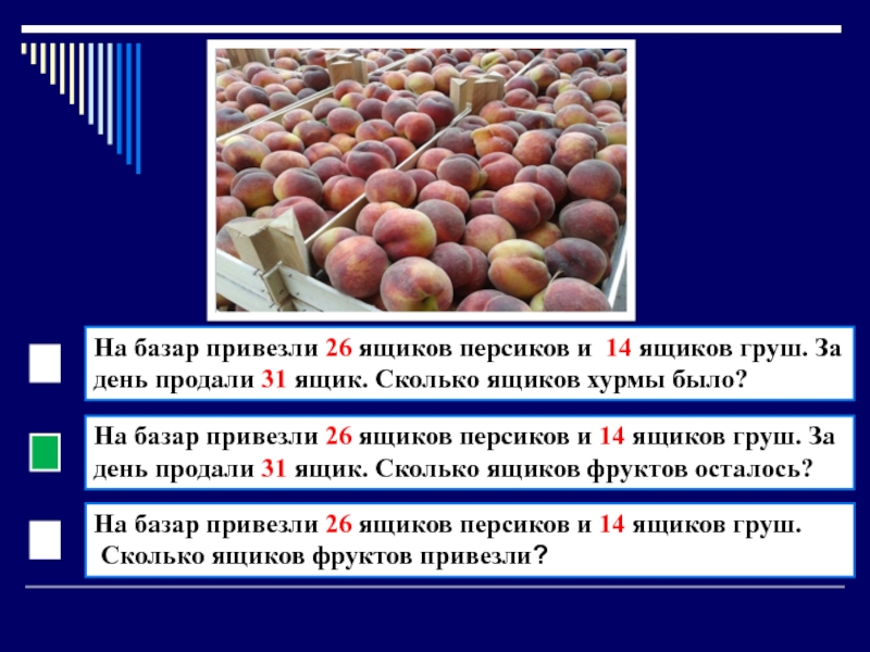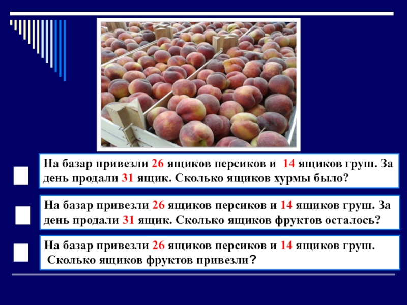На базар привезли 26 ящиков персиков и 14 ящиков груш.