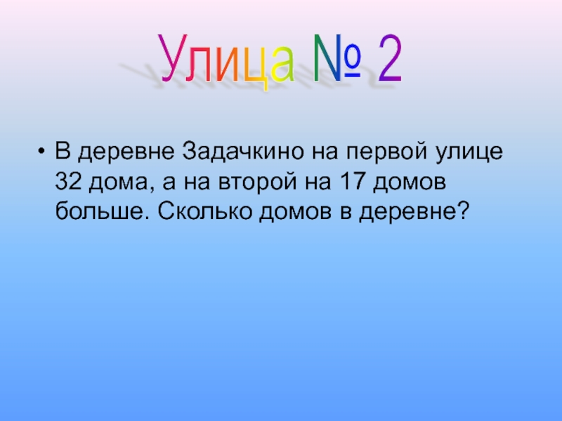 В деревне Задачкино на первой улице 32 дома, а на второй на 17 домов больше. Сколько домов
