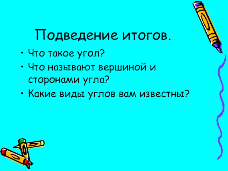 Подведение итогов.Что такое угол?Что называют вершиной и сторонами угла?Какие виды углов вам известны?