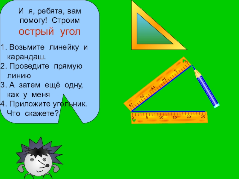 И я, ребята, вам помогу! Строим острый угол Возьмите линейку и карандаш. Проведите прямую линию А затем