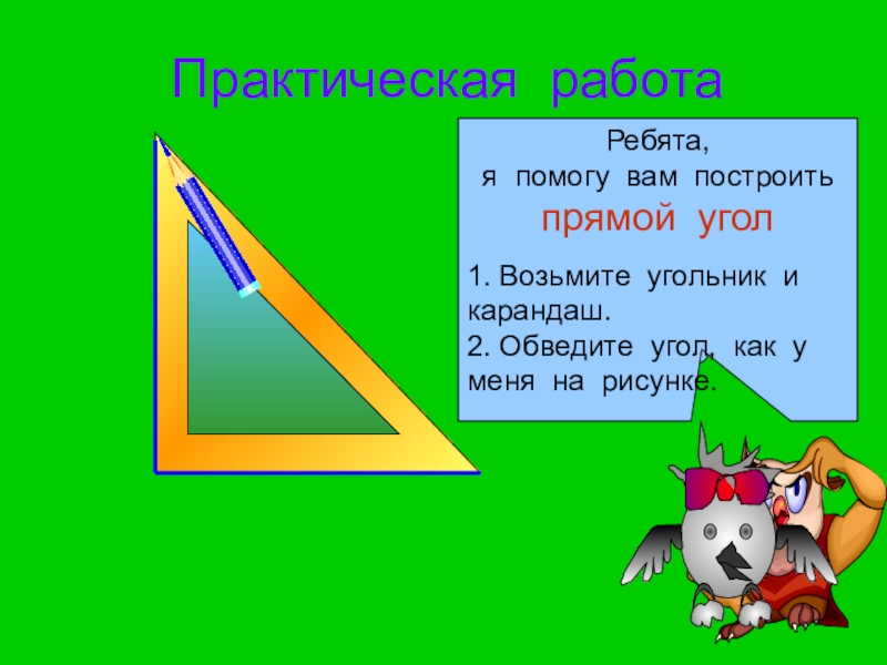 Практическая работаНачертите разные  углыРебята, я помогу вам построить прямой угол1. Возьмите угольник и карандаш.2. Обведите угол,