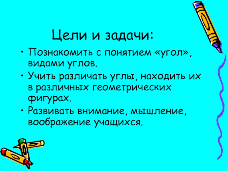 Цели и задачи:Познакомить с понятием «угол», видами углов.Учить различать углы, находить их в различных геометрических фигурах.Развивать внимание, мышление, воображение учащихся.