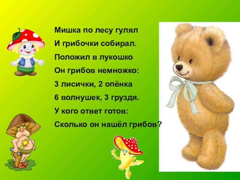Мишка по лесу гулялИ грибочки собирал.Положил в лукошкоОн грибов немножко:3 лисички, 2 опёнка6 волнушек, 3 груздя.У кого