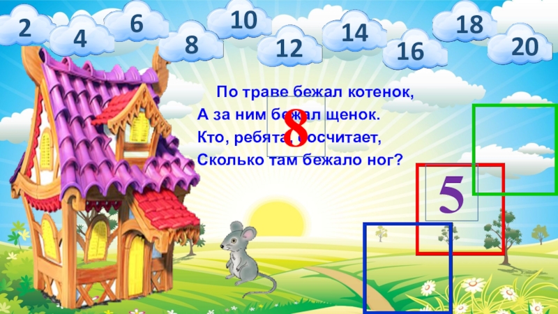 8462121416182010По траве бежал котенок,	А за ним бежал щенок.	Кто, ребята, сосчитает, 	Сколько там бежало ног?85