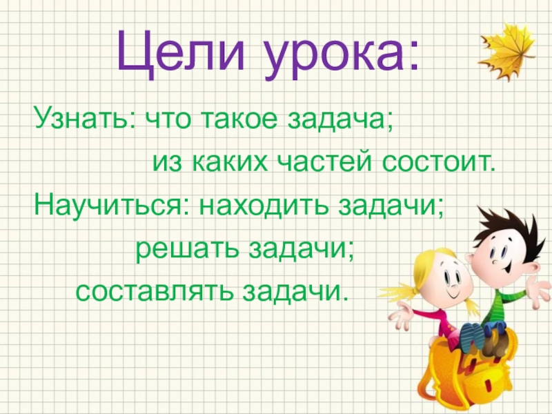 Цели урока:Узнать: что такое задача;       из каких частей состоит.Научиться: находить задачи;