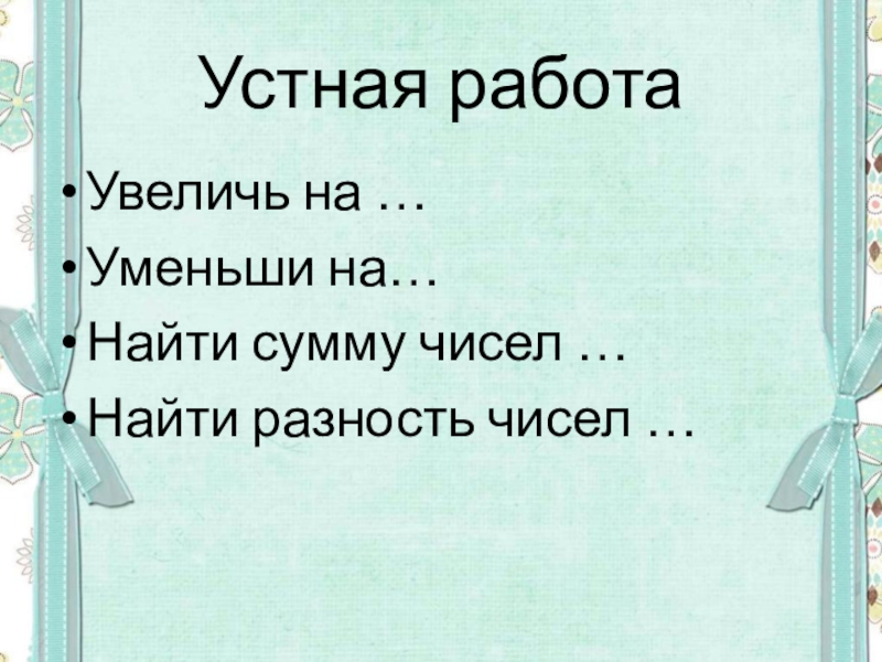 Устная работа Увеличь на … Уменьши на…Найти сумму чисел …Найти разность чисел …