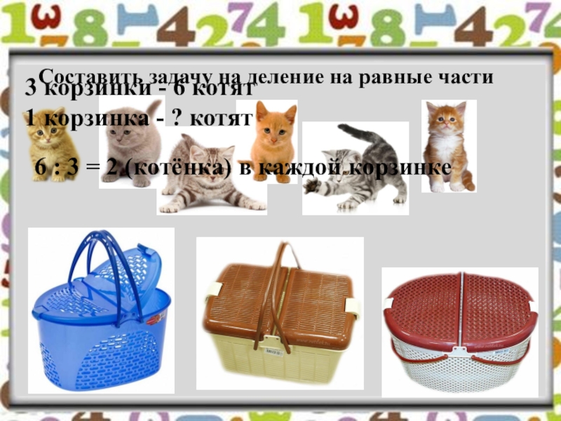 6 : 3 = 2 (котёнка) в каждой корзинке
