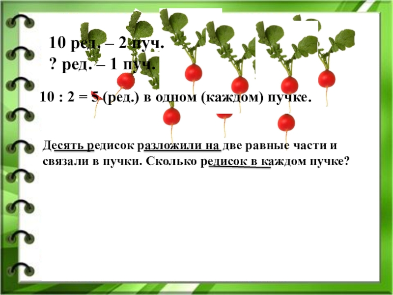 10 : 2 = 5 (ред.) в одном (каждом) пучке.