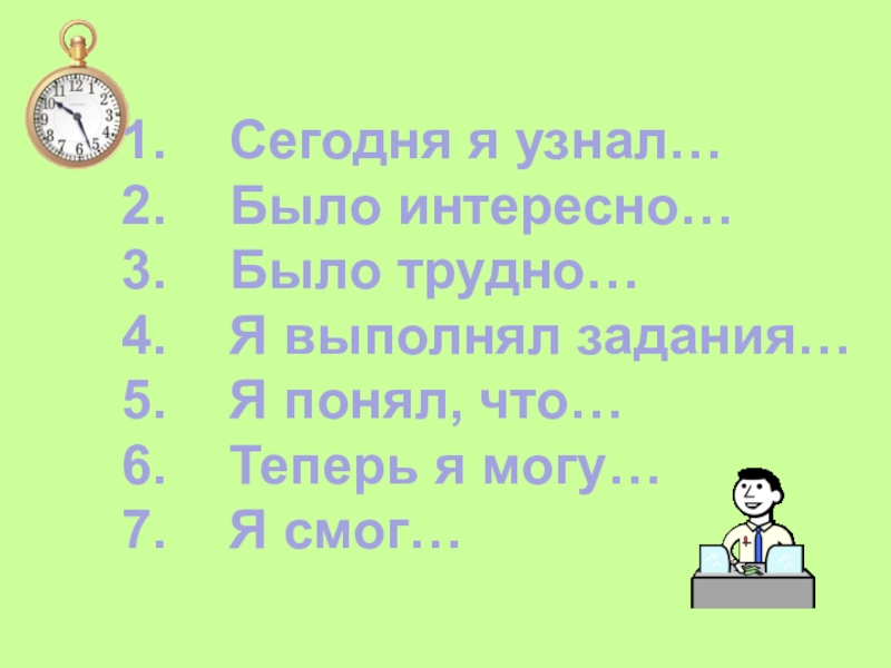 Сегодня я узнал…Было интересно…Было трудно…Я выполнял задания…Я понял, что…Теперь я могу…Я смог…