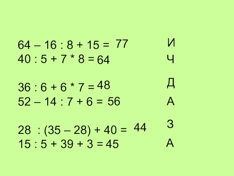 Слайд 6 64 – 16 : 8 + 15 = 40 : 5