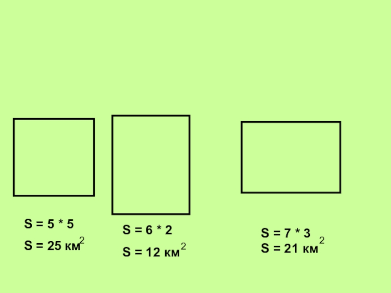 S = 5 * 5S = 25 км2S = 6 * 2S = 12 кмS = 7