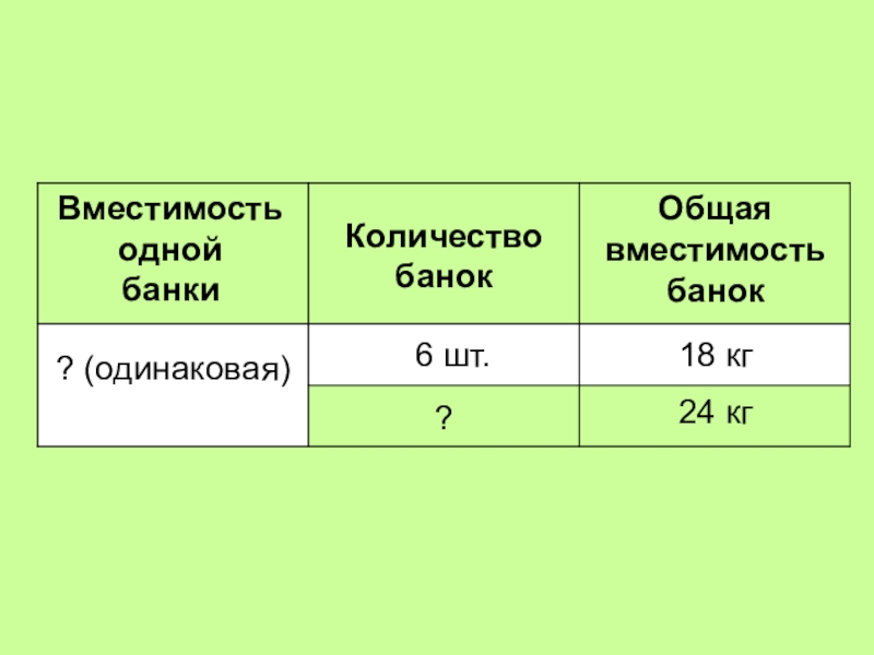 Вместимость одной банкиКоличество банокОбщая вместимость банок? (одинаковая)6 шт.?18 кг24 кг