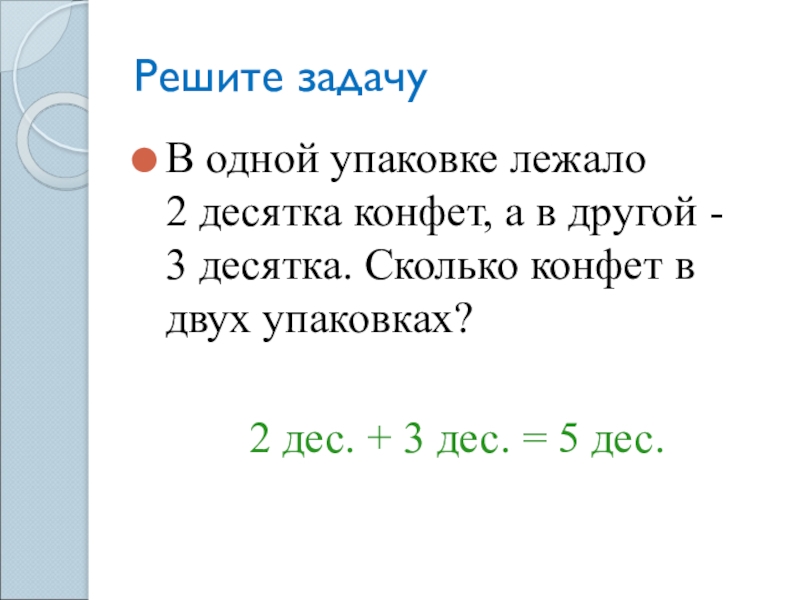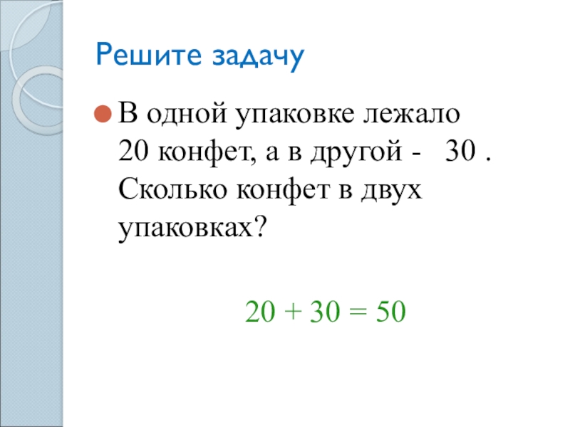 Решите задачуВ одной упаковке лежало     2 десятка конфет, а в другой -