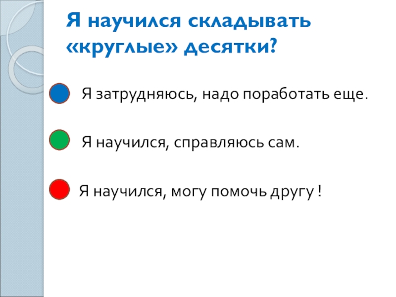 Я научился складывать «круглые» десятки?  Я затрудняюсь, надо поработать еще. Я научился, справляюсь сам.Я научился, могу