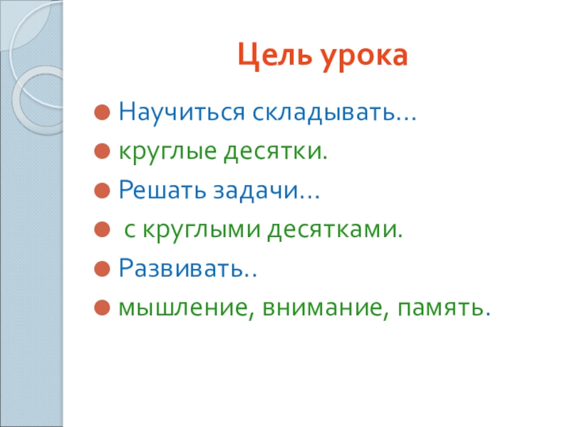 Цель урокаНаучиться складывать…круглые десятки.Решать задачи… с круглыми десятками.Развивать..мышление, внимание, память.