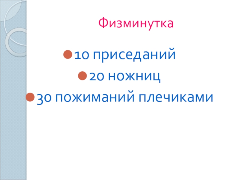 Физминутка10 приседаний20 ножниц30 пожиманий плечиками