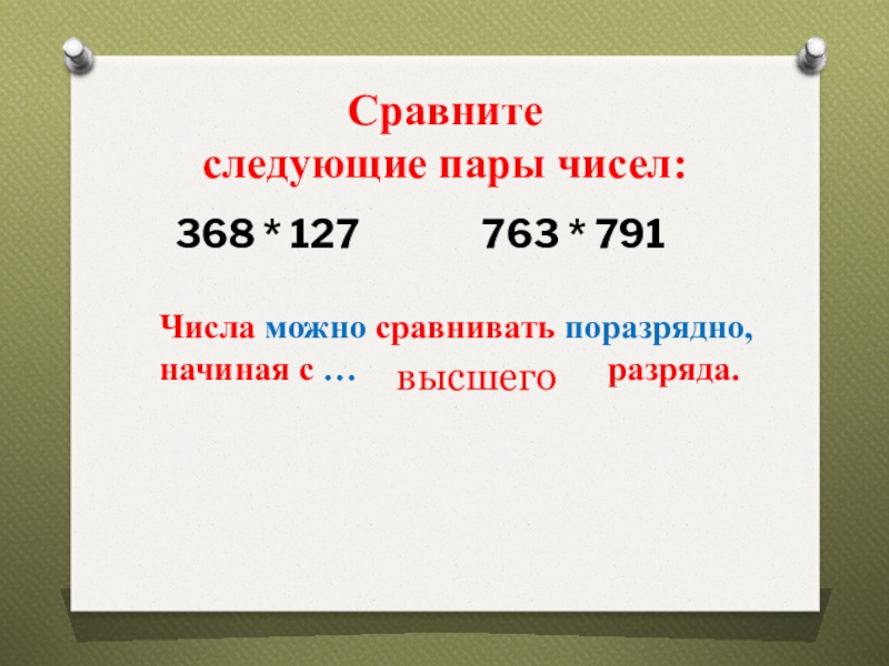 Числа можно сравнивать поразрядно, начиная с … разряда.