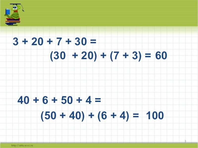 3 + 20 + 7 + 30 = 40 + 6 + 50 + 4 =(30 +