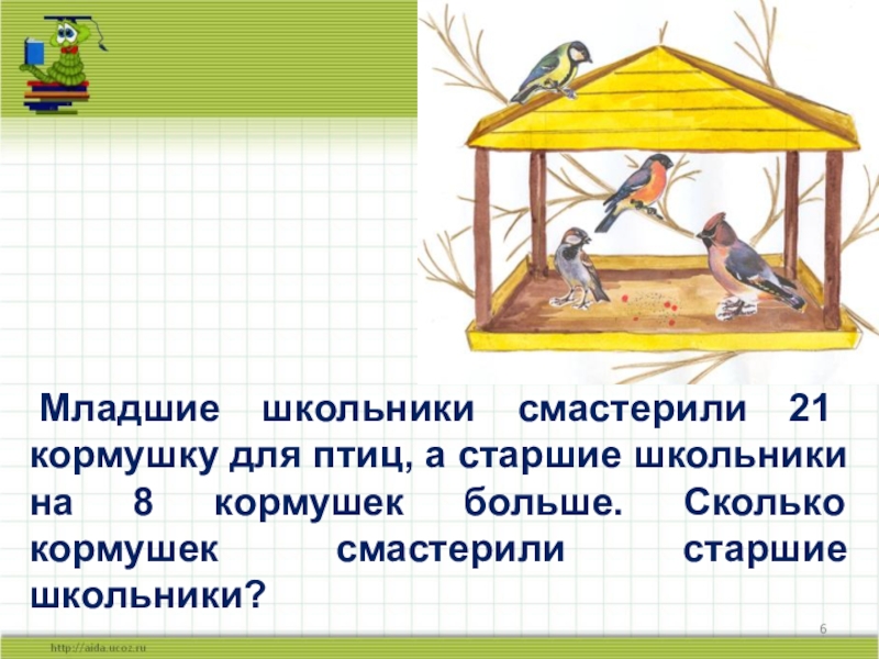 Младшие школьники смастерили 21 кормушку для птиц, а старшие школьники на 8 кормушек больше. Сколько кормушек