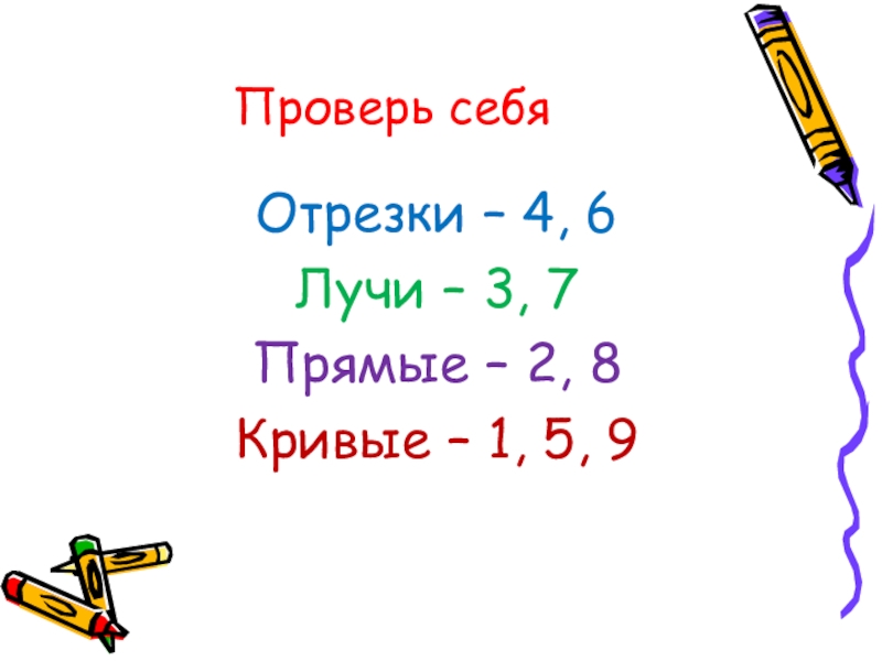 Проверь себяОтрезки – 4, 6Лучи – 3, 7Прямые – 2, 8Кривые – 1, 5, 9
