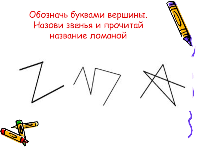 Слайд 10Обозначь буквами вершины. Назови звенья и прочитай название ломаной
