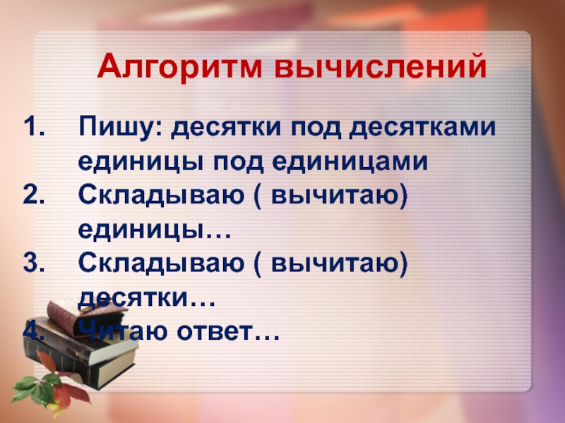 Пишу: десятки под десятками единицы под единицамиСкладываю ( вычитаю) единицы…Складываю ( вычитаю) десятки…Читаю ответ…Алгоритм вычислений