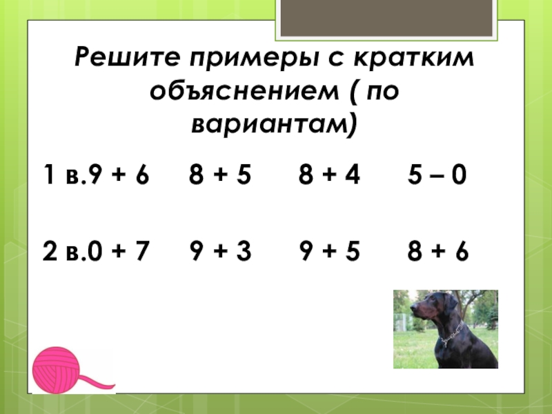 Решите примеры с кратким объяснением ( по вариантам)1 в.9 + 6   8 + 5