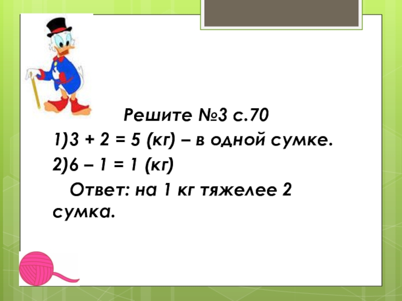 Решите №3 с.701)3 + 2 = 5 (кг) – в одной сумке.2)6 – 1 = 1 (кг)	Ответ: