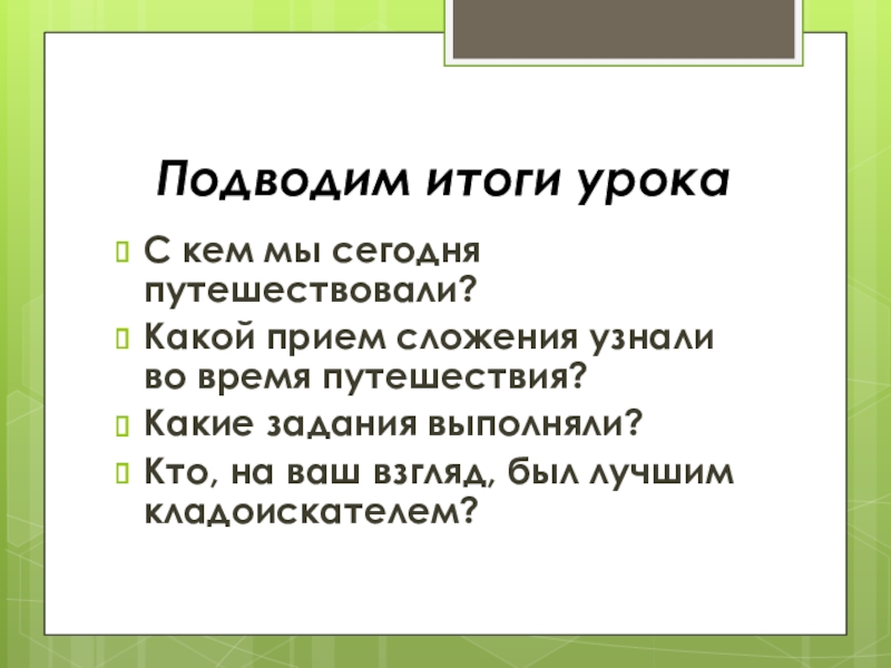 Подводим итоги урокаС кем мы сегодня путешествовали?Какой прием сложения узнали во время путешествия?Какие задания выполняли?Кто, на ваш