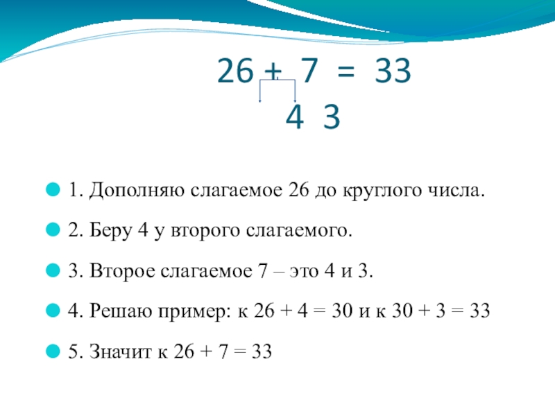 4. Решаю пример: к 26 + 4 = 30 и к 30 + 3 = 33