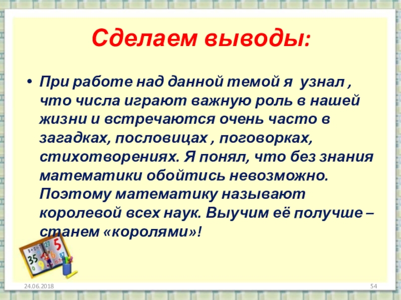 играют важную роль в нашей жизни и встречаются очень часто в загадках, пословицах , поговорках, стихотворениях. Я понял, что без знания математики обойтись невозможно. Поэтому математику называют королевой всех наук. Выучим её получше – станем «королями»!
