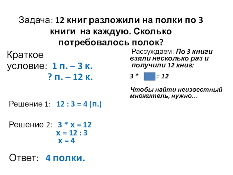 Решение 1: 12 : 3 = 4 (п.)
