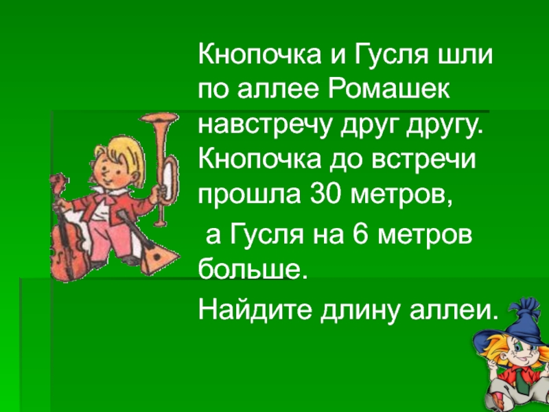 Кнопочка и Гусля шли по аллее Ромашек навстречу друг другу. Кнопочка до встречи прошла 30 метров, а