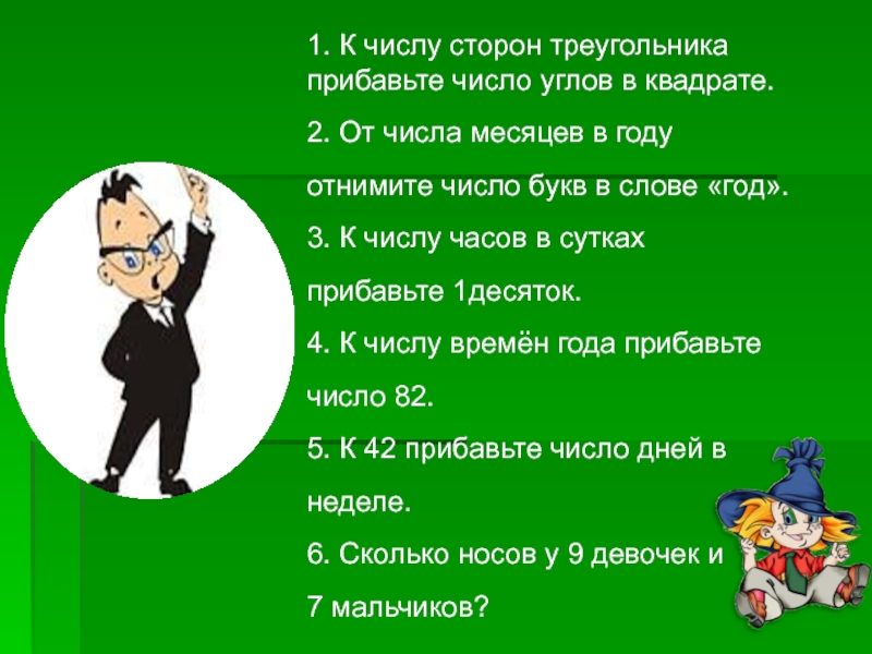 1. К числу сторон треугольника прибавьте число углов в квадрате.2. От числа месяцев в году отнимите число