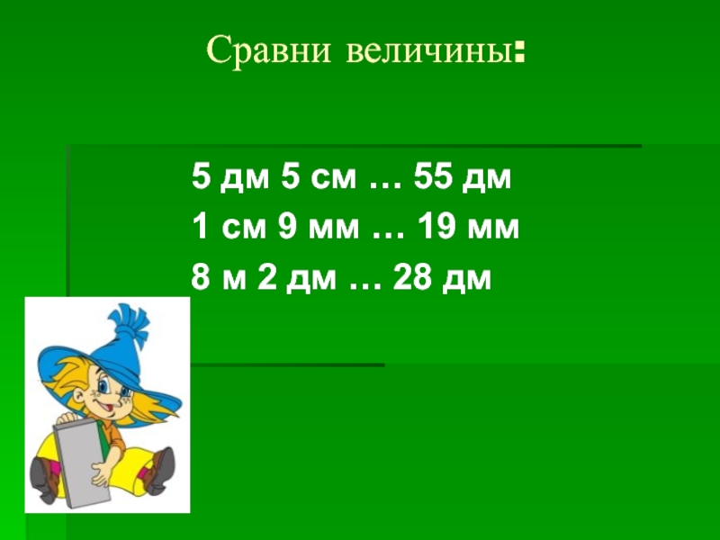 Сравни величины:  5 дм 5 см … 55 дм1 см 9