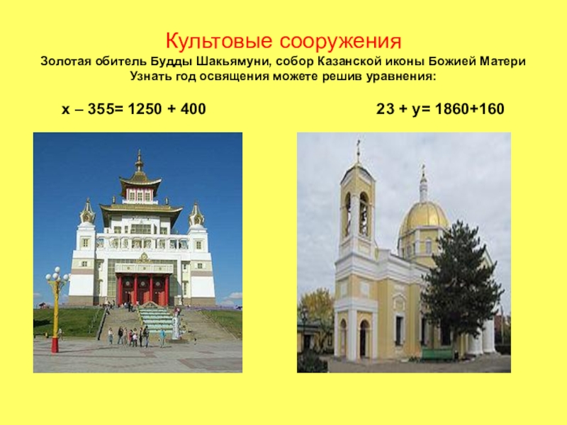 Культовые сооружения Золотая обитель Будды Шакьямуни, собор Казанской иконы Божией Матери Узнать год освящения можете решив уравнения:
