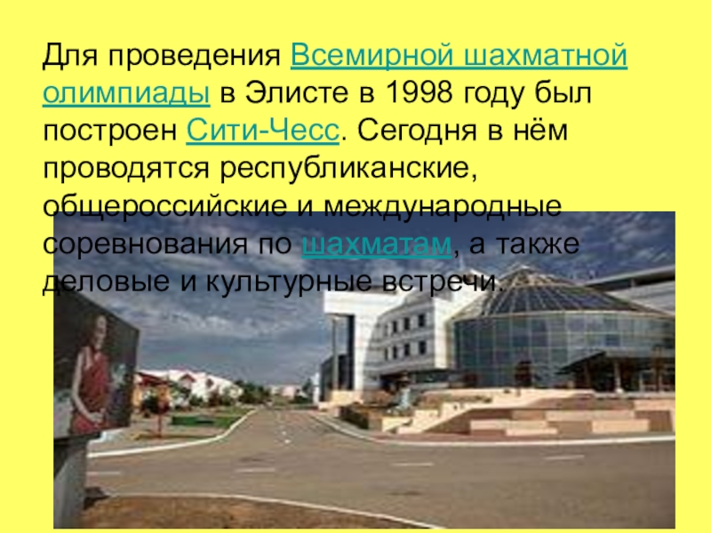 Для проведения Всемирной шахматной олимпиады в Элисте в 1998 году был построен Сити-Чесс. Сегодня