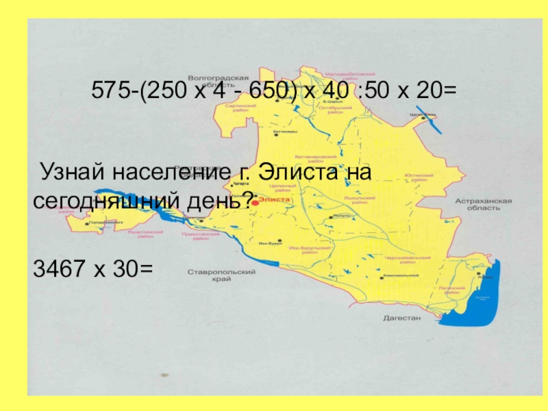 575-(250 х 4 - 650) х 40 :50 х 20= Узнай население г. Элиста на сегодняшний день?3467