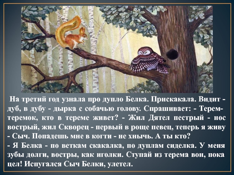 - Я Белка - по веткам скакалка, по дуплам сиделка. У меня зубы долги, востры, как иголки. Ступай из терема вон, пока цел! Испугался Сыч Белки, улетел.