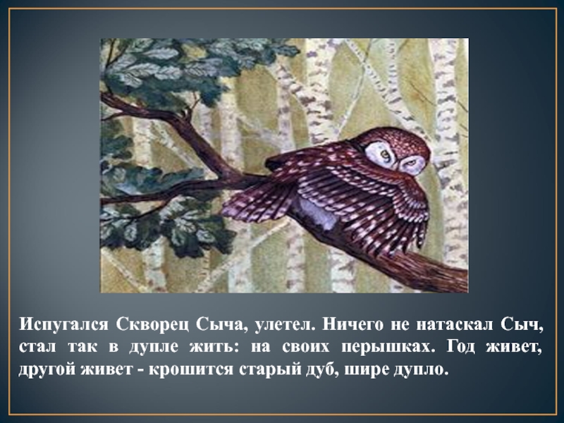 Слайд 10На третий год узнал про то дупло желтоглазый Сыч. Прилетел. Видит