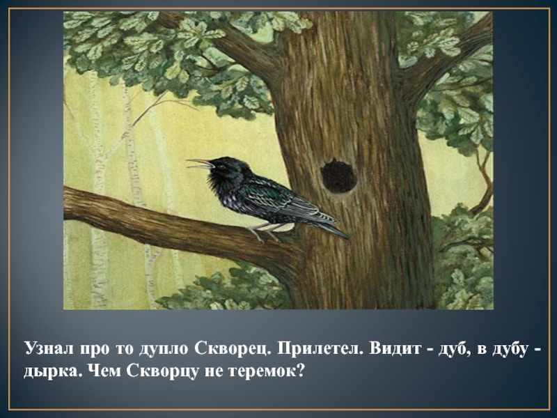 Слайд 6Узнал про то дупло Скворец. Прилетел. Видит - дуб, в дубу