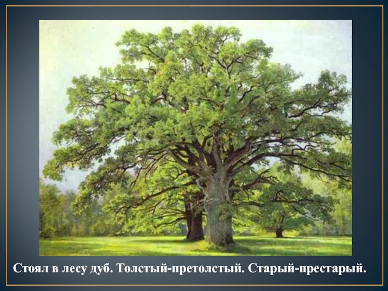 Слайд 2Стоял в лесу дуб. Толстый-претолстый. Старый-престарый.