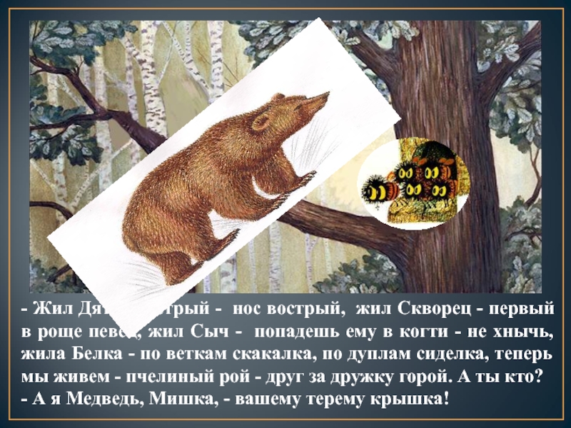 в роще певец, жил Сыч - попадешь ему в когти - не хнычь, жила Белка - по веткам скакалка, по дуплам сиделка, теперь мы живем - пчелиный рой - друг за дружку горой. А ты кто?