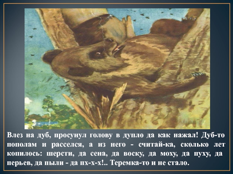 Слайд 22Влез на дуб, просунул голову в дупло да как нажал! Дуб-то