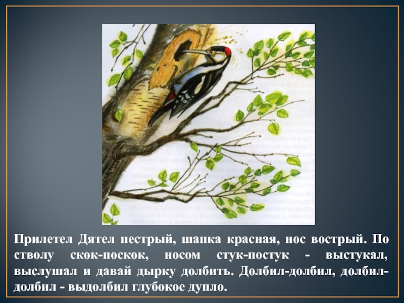 Слайд 3Прилетел Дятел пестрый, шапка красная, нос вострый. По стволу скок-поскок, носом