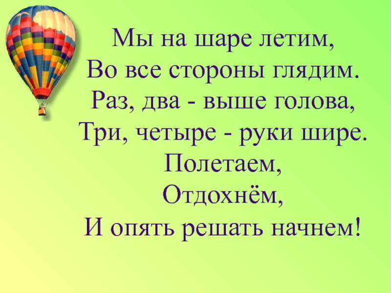 Мы на шаре летим, Во все стороны глядим.Раз, два - выше голова, Три, четыре - руки шире.Полетаем,