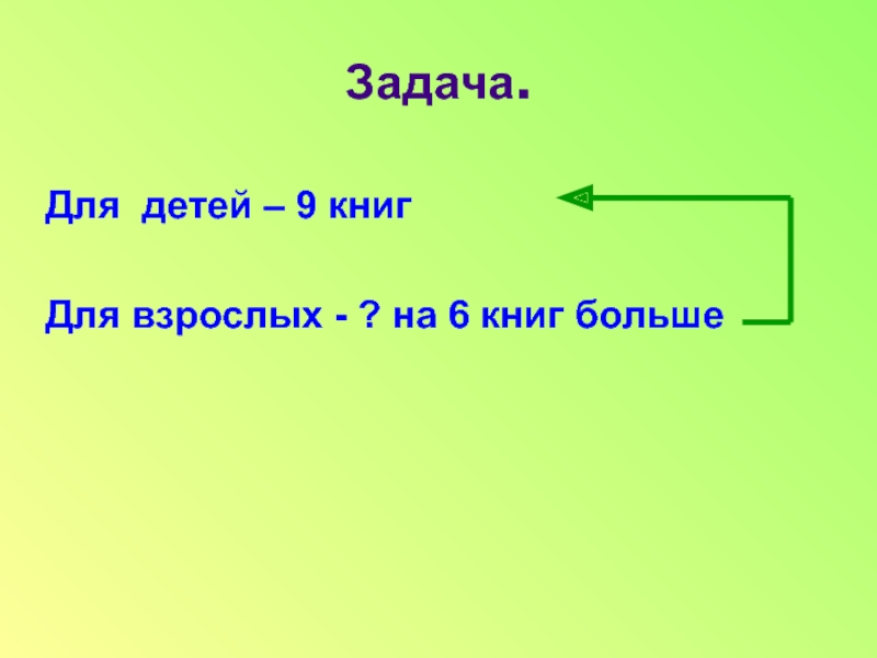 Задача.Для детей – 9 книгДля взрослых - ? на 6 книг больше