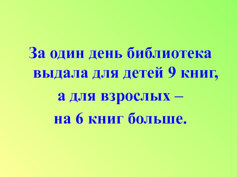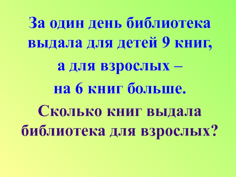 За один день библиотека выдала для детей 9 книг, а для взрослых – на 6 книг больше.