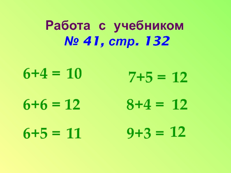 Работа с учебником  № 41, стр. 1326+4 = 6+6 = 6+5 = 7+5 = 9+3 =