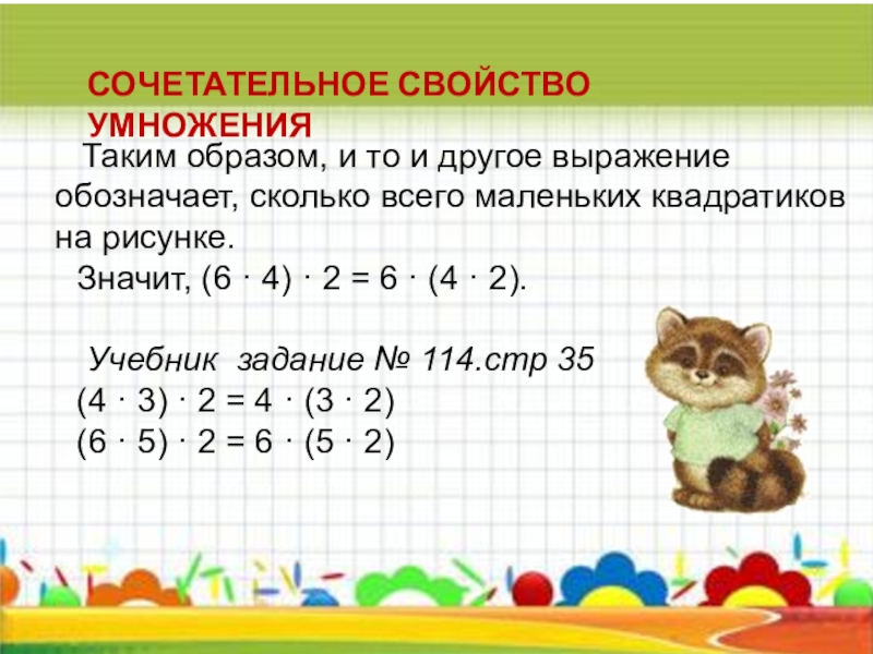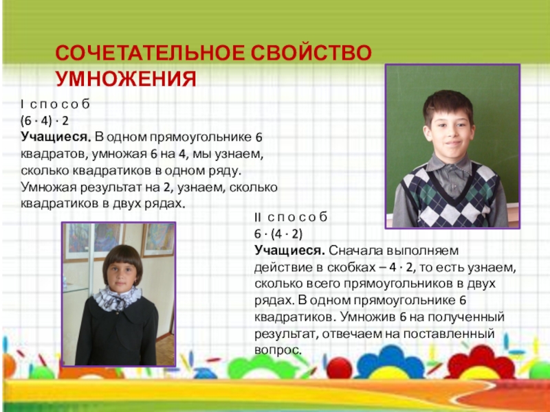 Учащиеся. Сначала выполняем действие в скобках – 4 · 2, то есть узнаем, сколько всего прямоугольников в двух рядах. В одном прямоугольнике 6 квадратиков. Умножив 6 на полученный результат, отвечаем на поставленный вопрос.